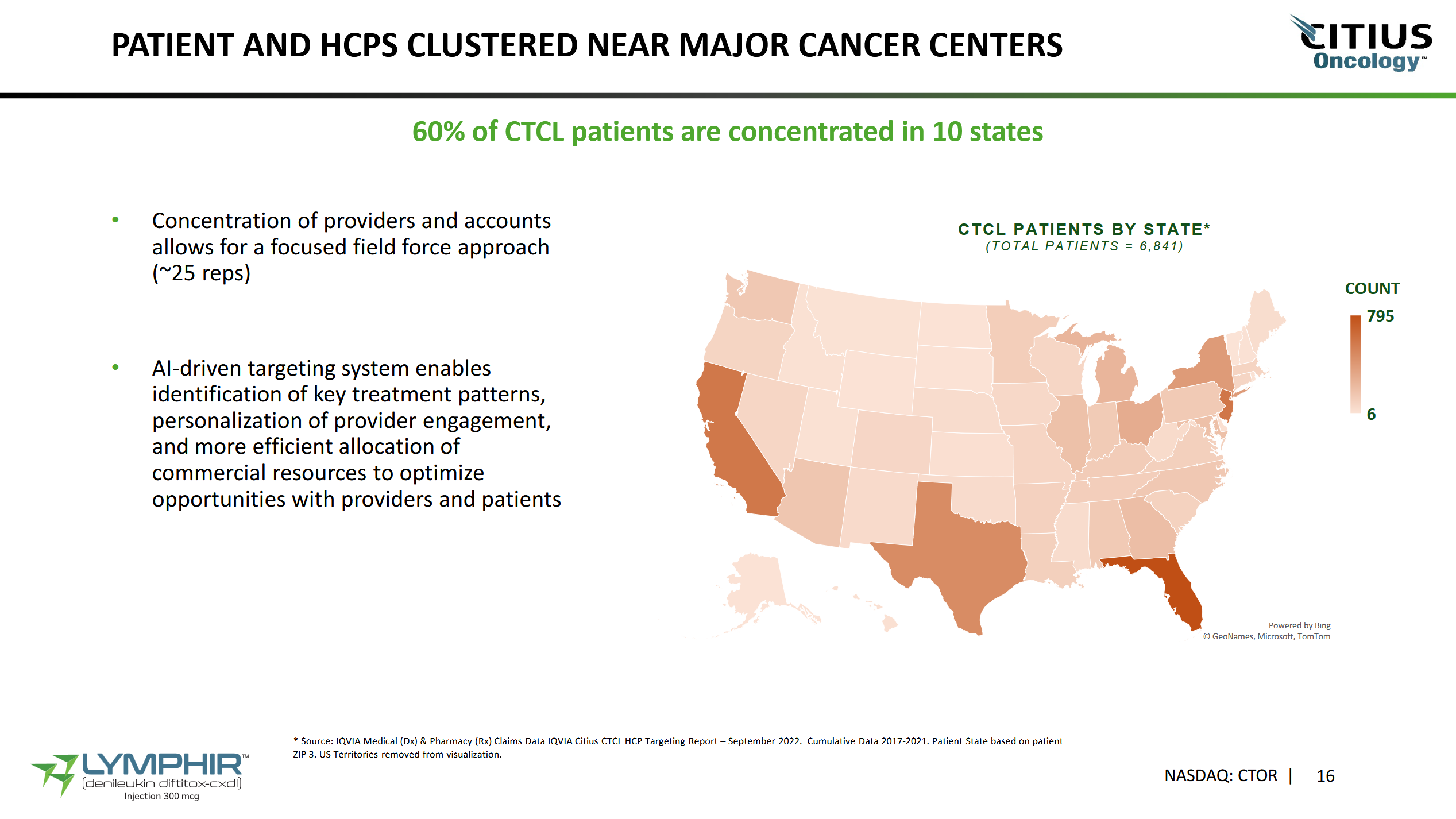 CTOR estimates the U.S. addressable market at over $400 million, based on internal research. But here's what amplifies that: 60% of all CTCL patients are concentrated in just 10 states. Only 10% of providers treat three or more patients. That means only 427 high-value prescriber accounts matter. A focused,